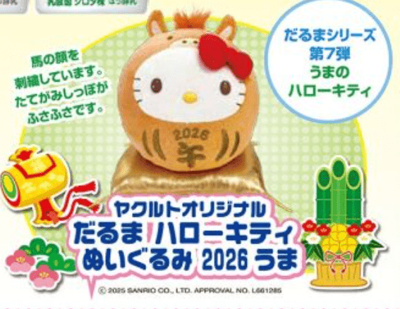 ヤクルトオリジナル だるまハローキティぬいぐるみは、2026年の午年デザインになります!
