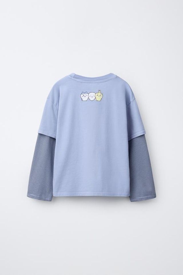 クルーネック、ロングスリーブダブルTシャツ。フロントとバックにCHIIKAWA © NAGANOのプリント入り。